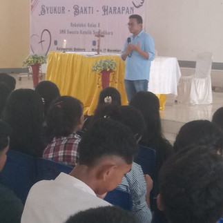 Kemudian, kegiatan dilanjutkan dengan sesi refleksi yang diberikan Pater Yanto Lobo, SVD. Sesi refleksi pertama adalah “Syukur”. P. Yanto mengajak siswa merenungkan manusia sebagai citra Allah yang memiliki kekuatan dan kelemahan diri.